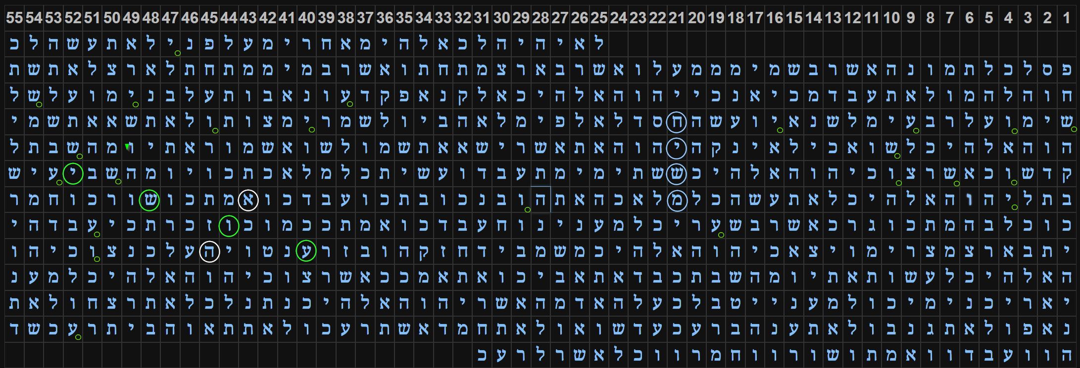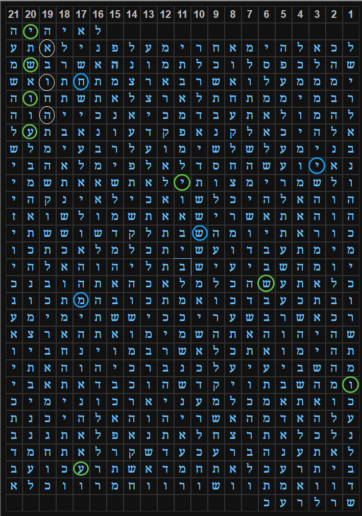 Interestingly enough, when one knows that the letter vaw (ו) means "nail" in Hebrew (as explained here: www.juliasneedledesigns.com/HebrewAlphabet.html and aside from the fact that it's also the number 6), it could be relevant to notice that nearby the word Yeshua, starting from the letter shin (ש), three letters to the right, three letters to the left and finally starting from the letter ayin (ע), three letters to the bottom you have each time the letter vaw. Hence we find a cross having an horizontal and a vertical bar of both seven letters within this width 77 grid appearing right here next to the center of the Law (which is the letter ה at position L_B(334) as already seen). Indeed the (7x7) square of 49 letters starting at position L_B(178) (as right upper corner) with the letter ש contains both the name of Yeshua and three nails forming a cross in this square which is centered one letter away from the center of L_B(334).